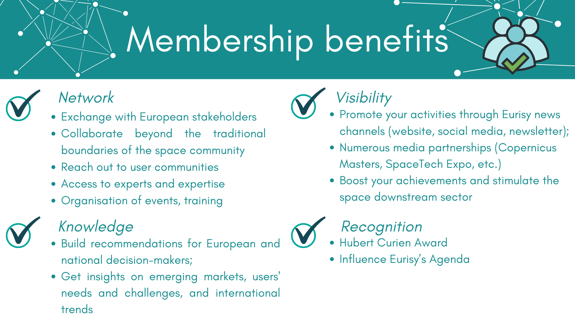 - Benefit from promotional activities, free entries to all Eurisy events, and open access to the complete Eurisy website and database;