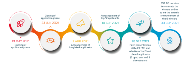 On 10 September, ESA will announce 12 finalists. On 28 September, the delegates of the Industrial Policy Evolution Working Group (IPE-WG) will select the six best-placed applicants who will be proposed for nomination as winners to ESA’s Director General Josef Aschbacher who will grant the awards: three for the upstream category, and three for the downstream category.