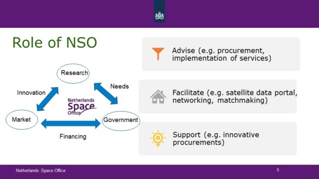 The Netherlands Space Office (NSO) stimulates the use of satellite-based data in civil society by advising the government (for example on how to procure or implement services based on satellite data), by facilitating access to data (e.g. through a data portal that can be accessed for free by Dutch entities), and by supporting the government and the industry to carry out innovation projects.
