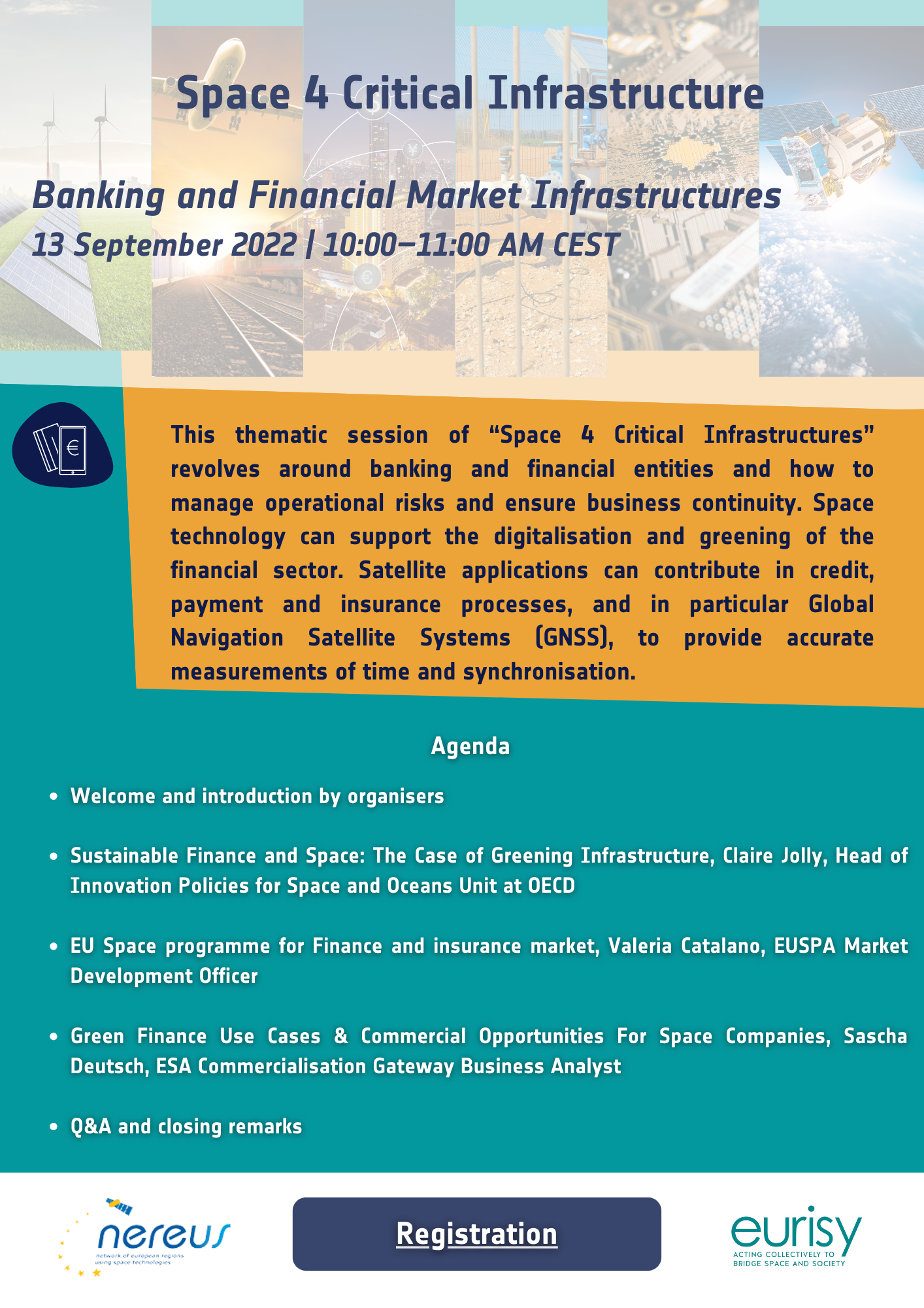 This thematic session of “Space 4 Critical Infrastructures” revolves around banking and financial entities and how to manage operational risks and ensure business continuity. Space technology can support the digitalisation and greening of the financial sector. Satellite applications can contribute in credit, payment and insurance processes, and in particular Global Navigation Satellite Systems (GNSS), to provide accurate measurements of time and synchronisation.