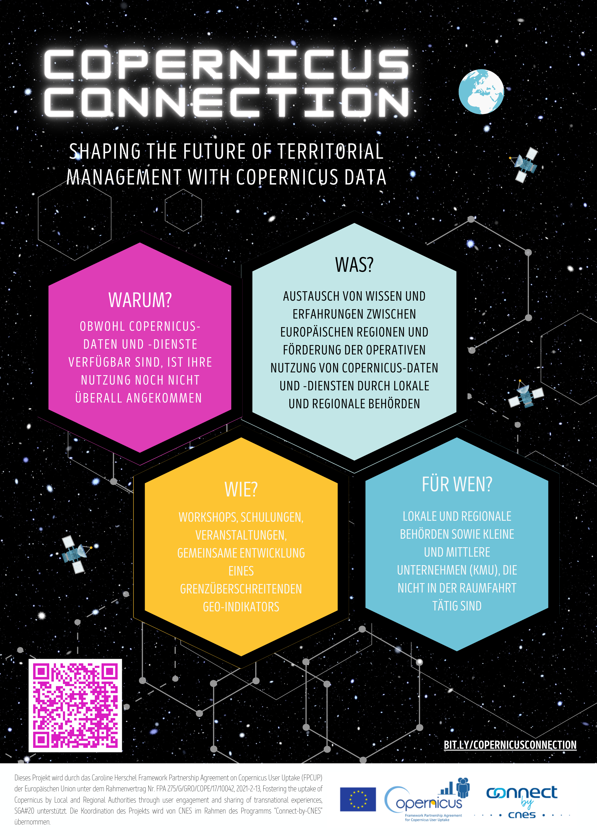 Dieses Projekt wird durch das Caroline Herschel Framework Partnership Agreement on Copernicus User Uptake (FPCUP) der Europäischen Union unter dem Rahmenvertrag Nr. FPA 275/G/GRO/COPE/17/10042, 2021-2-13, Fostering the uptake of Copernicus by Local and Regional Authorities through user engagement and sharing of transnational experiences, SGA#20 unterstützt. Die Koordination des Projekts wird von CNES im Rahmen des Programms “Connect-by-CNES” übernommen.