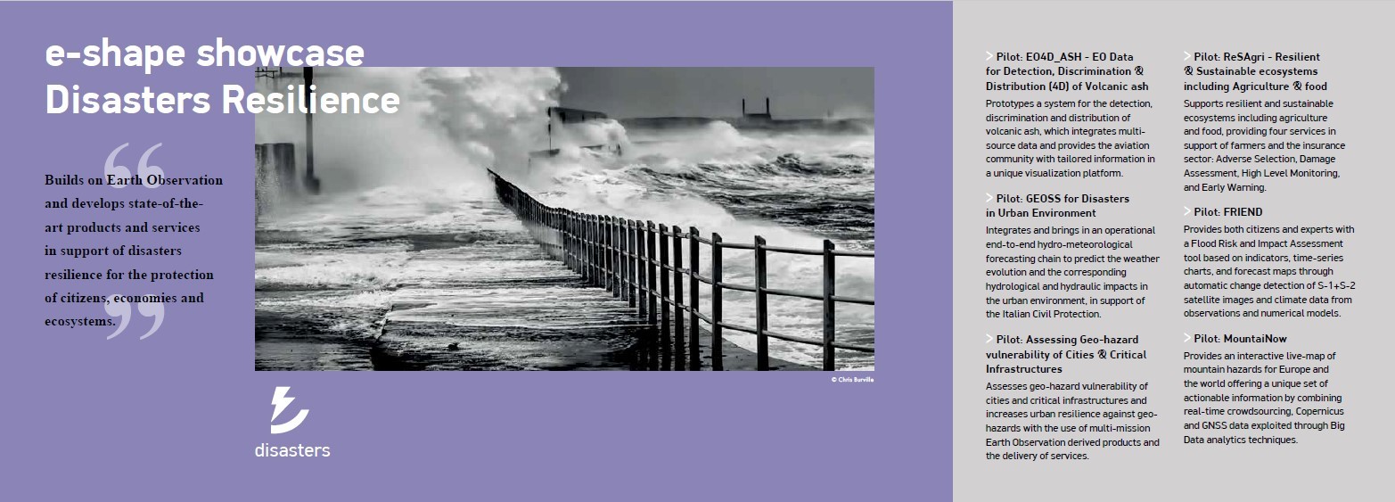 - Introduce EO-based applications developed through the project within the 7 e-shape thematic showcases: Agriculture, Health, Energy, Ecosystem, Water resources, Disaster Resilience, Climate;