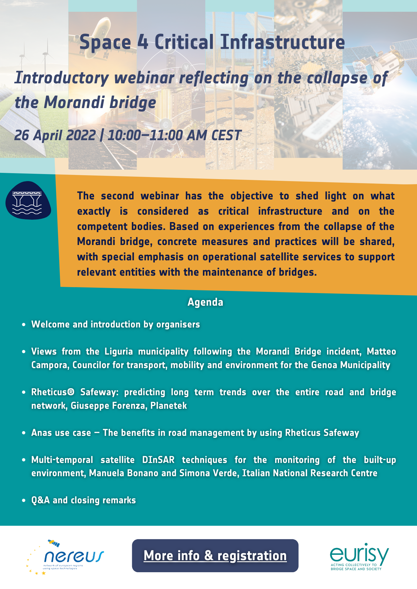 This second session of the introductory part on “Space for Critical Infrastructures” will shed light on what exactly is considered as critical infrastructure and on the competent bodies. Based on experiences from the collapse of the Morandi bridge, concrete measures and practices will be shared, with special emphasis on operational satellite services to support relevant entities with the maintenance of bridges.