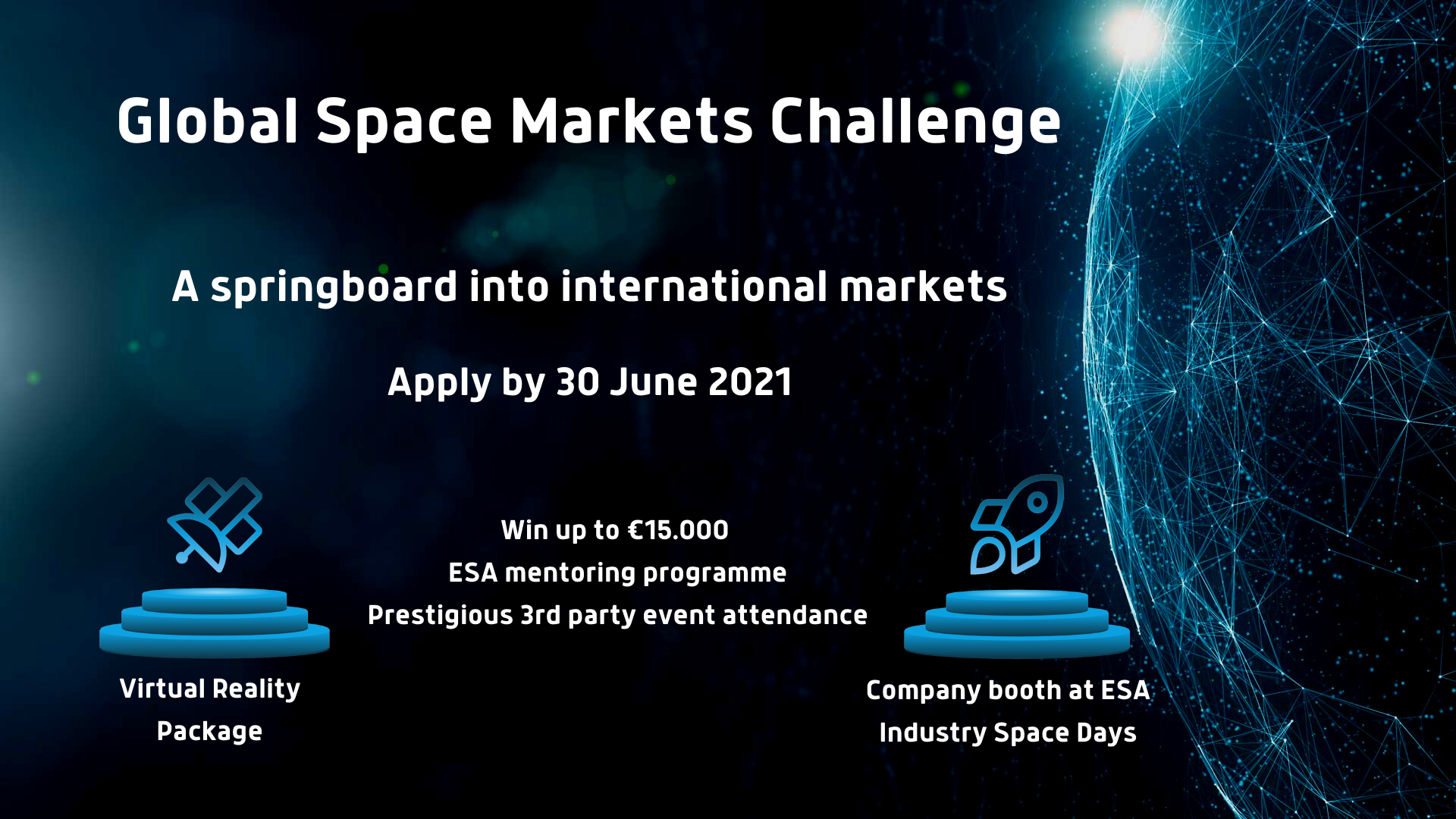 ESA will design, with the assistance of each of the category’s winners, a prospective ESA mentoring programme, addressing the specific needs of each winner to their internationalisation plans (1st place: EUR 15,000; 2nd place EUR 10,000; 3rd place EUR 5,000).